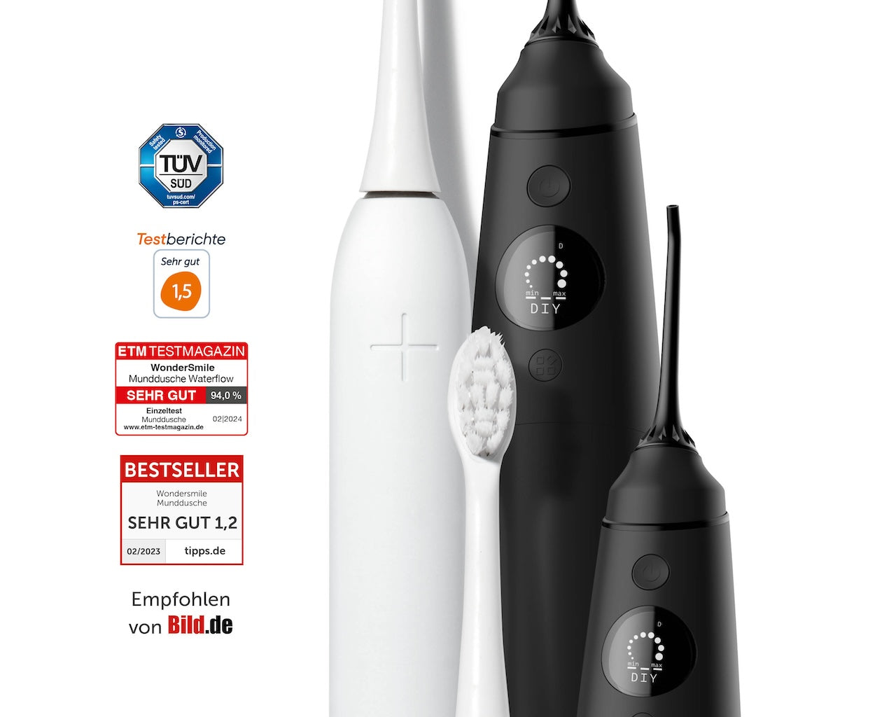 Wenn Du eine elektrische Zahnbürste kaufen möchtest, kommt noch mehr Auswahl auf Dich zu. Seid Ihr zu zweit und möchtet auf Schalltechnologie umsteigen? In unserem Couple Bundle sind direkt zwei Produkte inklusive Austausch-Bürstenköpfe enthalten. Bist Du oft unterwegs? Dann ist im Travel Care Bundle alles drin, was Du für die Reise benötigst. Wenn Du ein rundum Mundhygiene-Erlebnis möchtest, dann haben wir das Ultimate Oral Care Bundle, das neben der Bürste auch eine Munddusche enthält. Mit diesem deckst Du Deine Zahnpflege von A wie Aufhellen bis Z wie Zahnzwischenraum-Reinigung ab. Da wir bei Wondersmile auch einen großen Wert auf Design und Stil legen, kannst Du Dich zusätzlich entscheiden, ob Deine elektrische Zahnbürste schwarz, klassisch weiß oder ausgefallen und rosa sein soll.