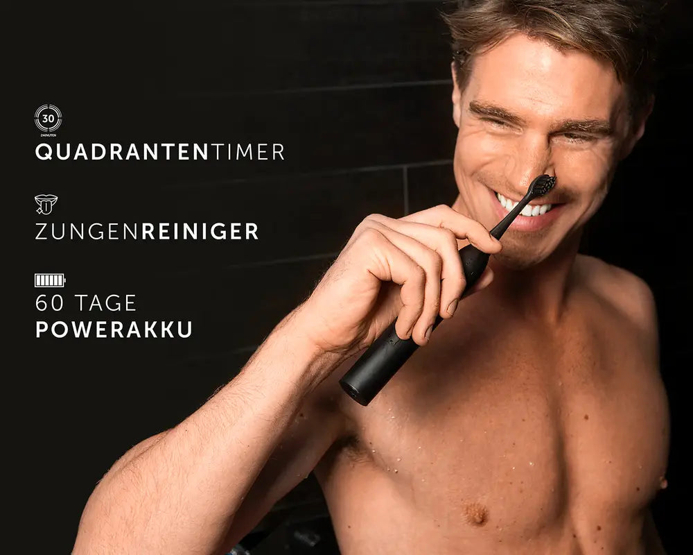 Unsere Schallzahnbürste kombiniert Geschicklichkeit mit Effizienz in einem Design, das nicht nur bequem in deiner Hand liegt, sondern auch optisch in deinem Badezimmer hervorsticht. Seine schlanke Form und fortschrittliche Technik bieten ein erstklassiges Reinigungserlebnis – eine perfekte Mischung aus Bequemlichkeit und klassischem Stil. Es ist ein tägliches Highlight für die Zahnpflege, das sich mühelos in deinen Alltag integriert.